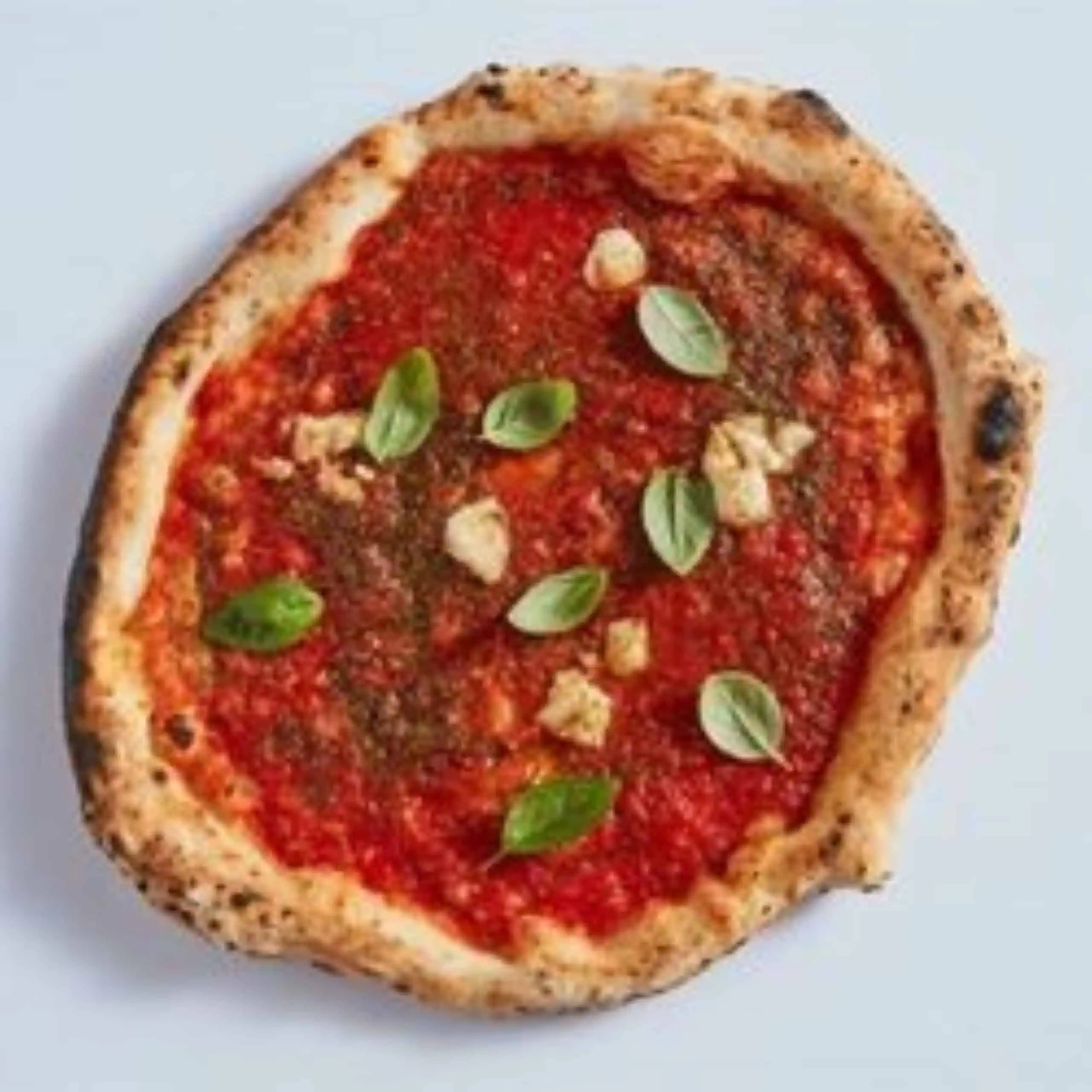 Solania San Marzano, Coconut Cheese, Roasted Capsicum, Mushrooms, Eggplant, Zucchini, Gaeta Black Olives, Basil, EVOO