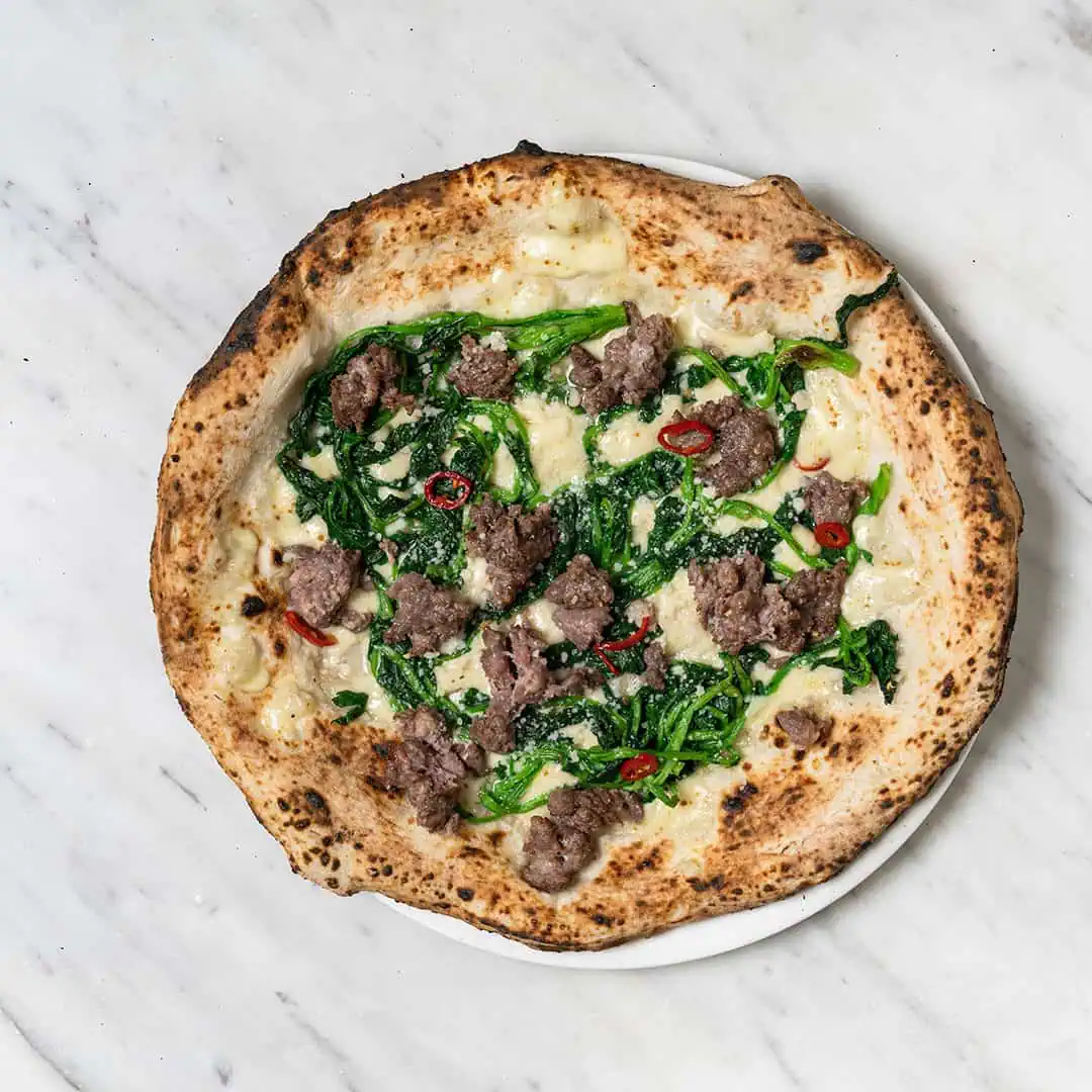 Fior Di Latte, Free Range Pork Sausage, Friarielli ( Broccoli Rabe), Provola Cheese, Chilli, Basil, EVOO